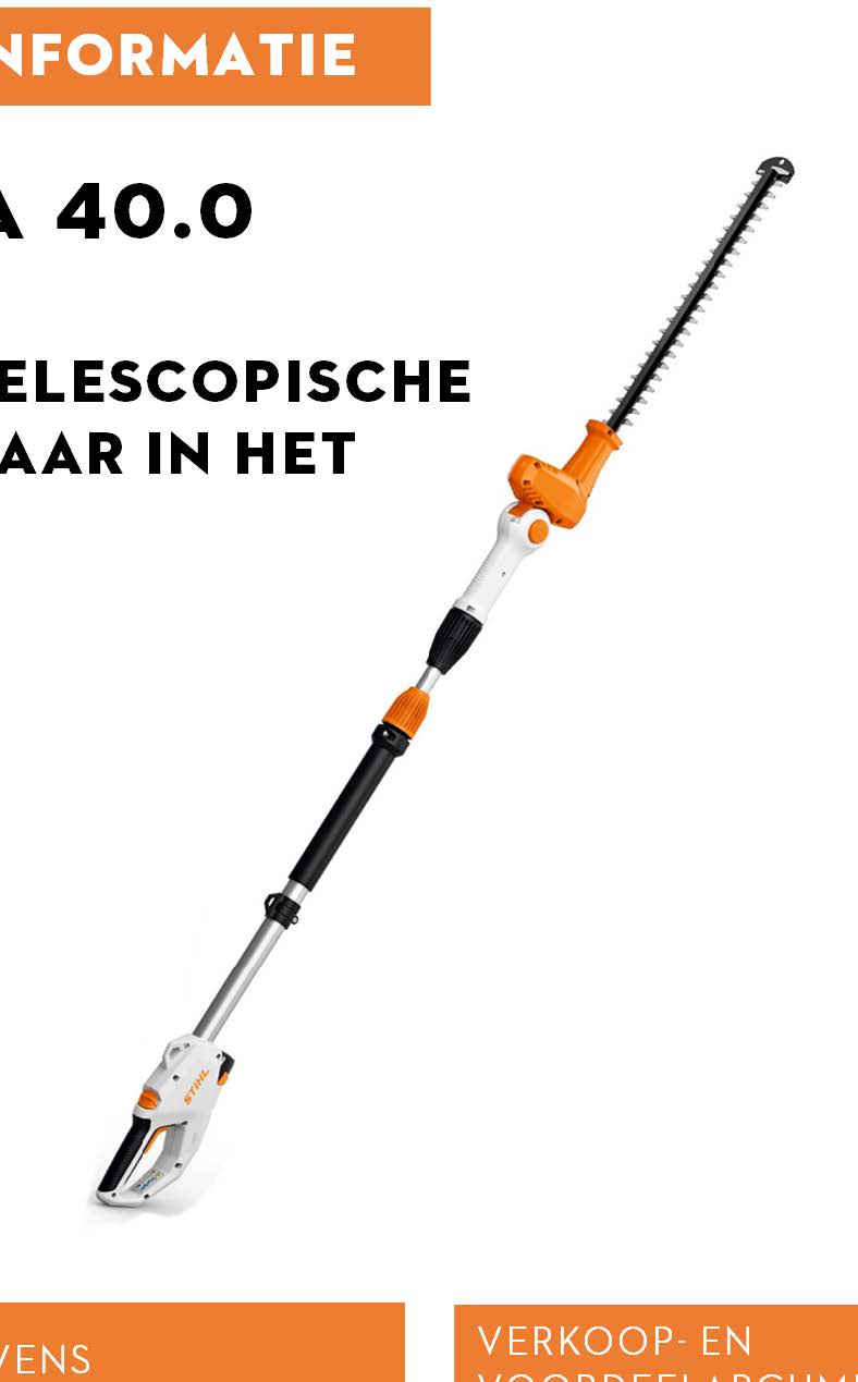 De STIHL HLA 40.0 is de eerste telescopische accu-heggenschaar binnen het STIHL AS-systeem, speciaal ontwikkeld voor het moeiteloos knippen van hoge hagen vanaf de grond. Dankzij de grote reikwijdte tot 4,1 meter kunt u comfortabel werken zonder ladder en behoudt u maximale veiligheid.