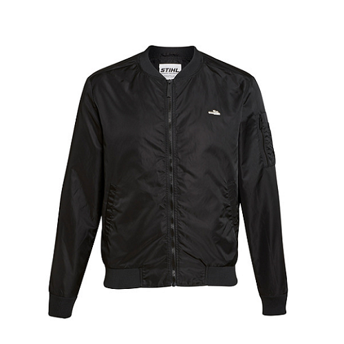 De coole variant van een tussenseizoenjasje: een satijnlook met contrasterende geribbelde boord aan de hals, mouwen ene zoom. Praktisch: zijzakken met split en een klein zakje met rits op de linkermouw. Metalen klinknagels met kettingzaag op de borst, klein geweven label op de rug.