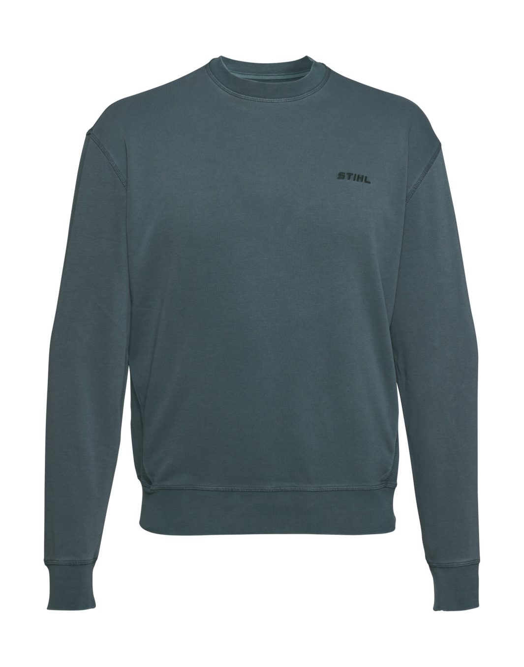 Dit uniseks petrolblauw sweatshirt met licht doorgestikte schouders is geverfd volgens de Garment Dye-methode. Elk sweatshirt heeft een iets andere kleur. Het garen is gemaakt van biologisch katoen en gerecycleerd polyester. Op de borst is het STIHL logo geborduurd.