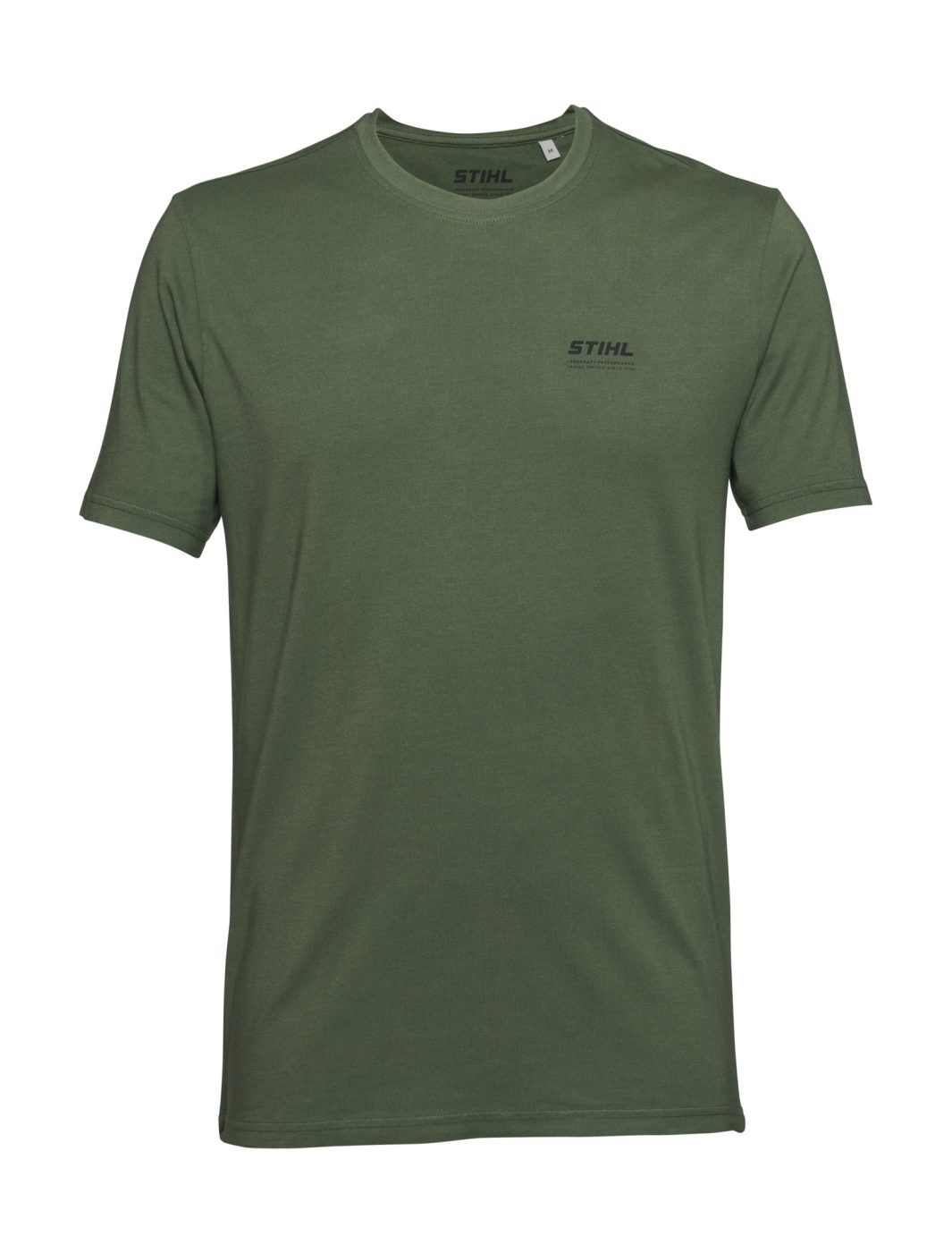 Dit groene T-shirt voor heren is perfect voor dagelijks gebruik. Het heeft een ronde hals en een eenvoudige, relaxte pasvorm. Een discreet STIHL LEGENDARY PERFORMANCE opschrift in een organische kleur siert de borst. De zachte single jersey stof is gemaakt van katoen en modal.