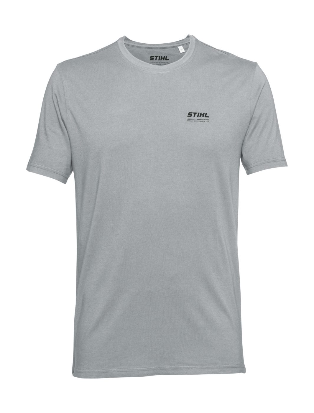Dit grijze T-shirt voor heren is perfect voor dagelijks gebruik. Het heeft een ronde hals en een eenvoudige, relaxte pasvorm. Een discreet STIHL LEGENDARY PERFORMANCE opschrift in een organische kleur siert de borst. De zachte single jersey stof is gemaakt van katoen en modal.